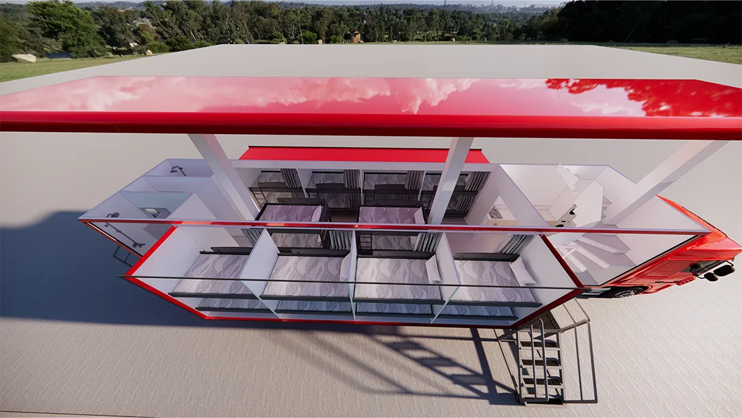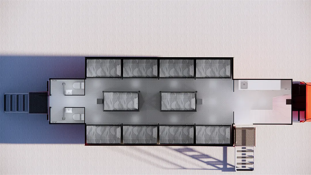 A "Living Container" is a portable housing unit generally designed to meet a housing need. These types of containers generally have a modular design and may be equipped to meet basic living needs in order to provide a comfortable living space.